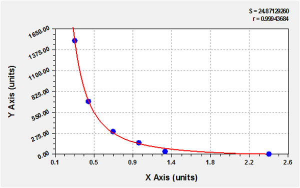 ELISA操作步驟復(fù)雜,影響反應(yīng)因素較多,特別是固相載體的包被難達到各個體之間的一致,因此在定量測定中,每批測試均須用 一系列不同濃度的參考標準品在相同的條件下制作標準曲線。測定大分子量物質(zhì)的夾心法ELISA,標準曲線的范圍一般較寬, 曲線最高點的吸光度可接近2.0,繪制時常用半對數(shù)值,以檢測物的濃度為橫坐標,以吸光度為縱坐標,將各濃度的值逐點連接, 所得曲線一般呈S形,其頭、尾部曲線趨于平坦,中央較呈直線的部分是最理想的檢測區(qū)域。測定小分子量物質(zhì)常用競爭法, 其標準曲線中吸光度與受檢物質(zhì)的濃度呈負相關(guān)。標準曲線的形狀因試劑盒所用模式的差別而略有不同。ELISA測定的標準曲線注意圖中 橫坐標為對數(shù)關(guān)系,這更有利于測定系統(tǒng)的表達。