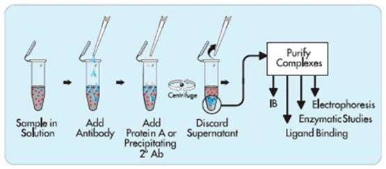 IP是利用抗原蛋白質和抗體的特異性結合以及細菌蛋白質的“protein A/G"特異性地結合到抗體(免疫球蛋白)的FC片段的現象開發出來的方法。目前多用proteinA/G預先結合在argarosebeads上,使之與含有抗原的溶液及抗體反應后,beads上的prorein A/G就能達到吸附抗原的目的。通過低速離心,可以從含有目的抗原的溶液中將目的抗原與其它抗原分離。