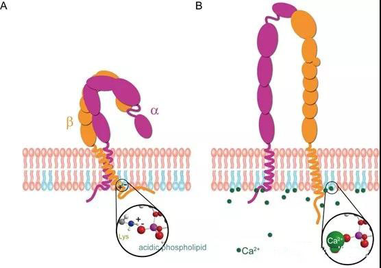 在靜息狀態下,酸性磷脂通過與?2-K702和?L形成三元相互作用穩定跨膜區異源二聚體構象,從而將整合素維持在低親和力構象。T細胞活化引起鈣離子內流,內流的鈣離子通過與酸性磷脂競爭性結合,打破靜息狀態下的三元靜電作用,引起整合素跨膜區異源二聚體的分離...